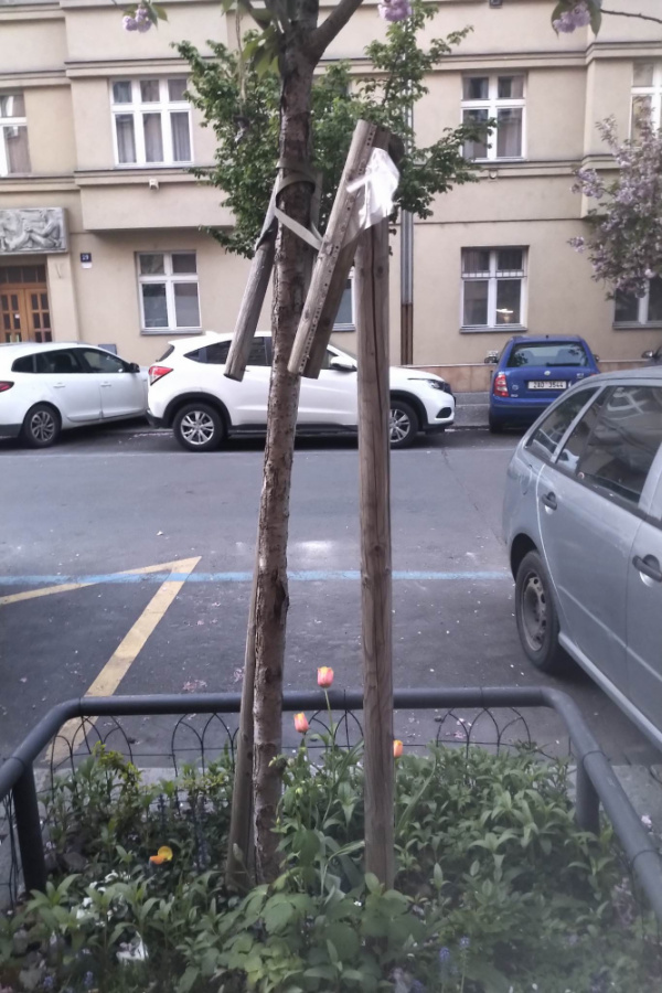 zničené kotvení u nové výsadby - někdo odcizil jeden kůl. kotvení se nyní opírá o strom místo toho aby jej podpíralo.