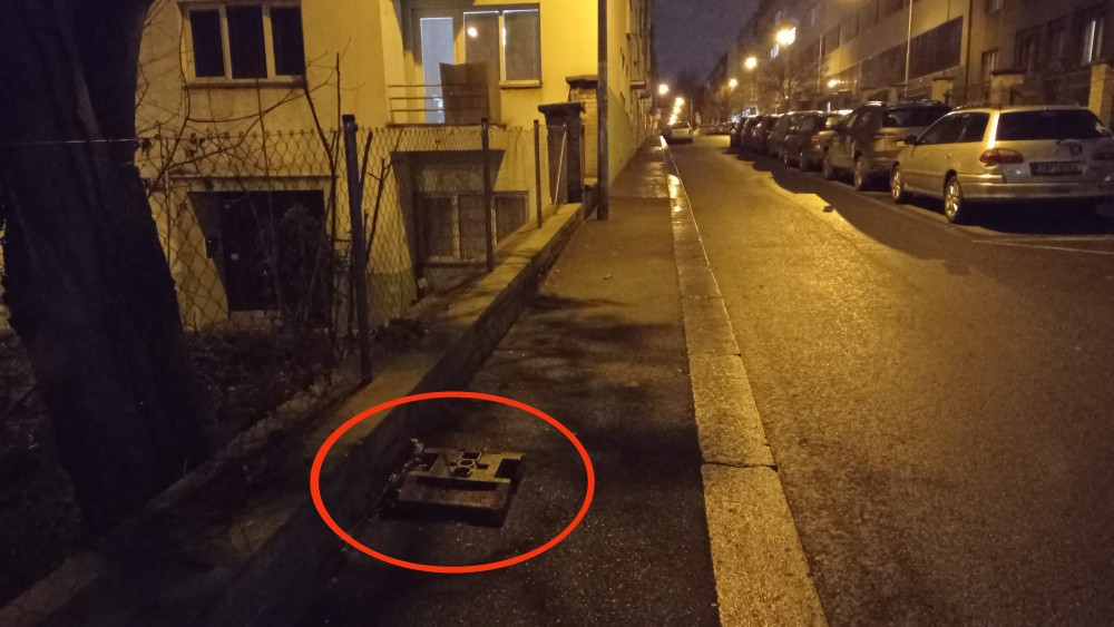 V ulici Kouřimská se u lampy 302 796 nachází zapomenutý podstavec po přenosné DZ.