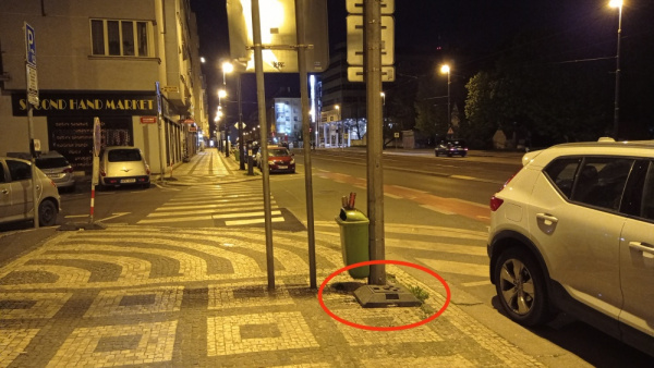 Na křižovatce Vinohradská x Hradecká se nachází zapomenutý podstavec po přenosné DZ.