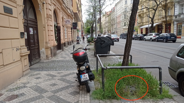 V ulici Korunní se u lampy 302 649 nachází v trávě u stromu zapomenutý podstavec po přenosné DZ.