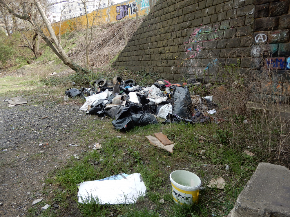 Pod mostem v ulici K Cervenemu dvoru je vyvezena hromada neporadku.