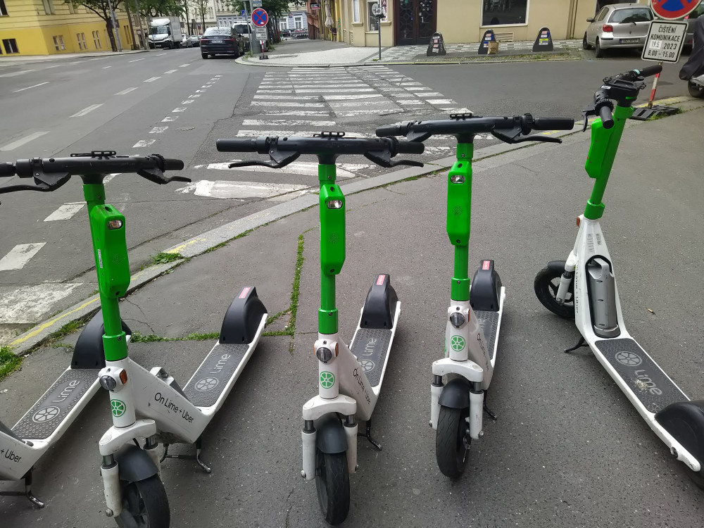 Hromadné parkovaní sdílené koloběžek po cele sirce chodníku a zatarasení přechodu pro chodce v ulici Slavíková, křižovatka Zvonařová