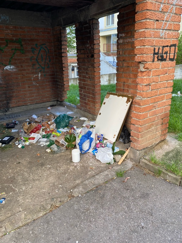 Poprosím odvést nepořádek viz foto. O odstranění přístřešku na kontejnery jednám s odborem životního prostředí P3.