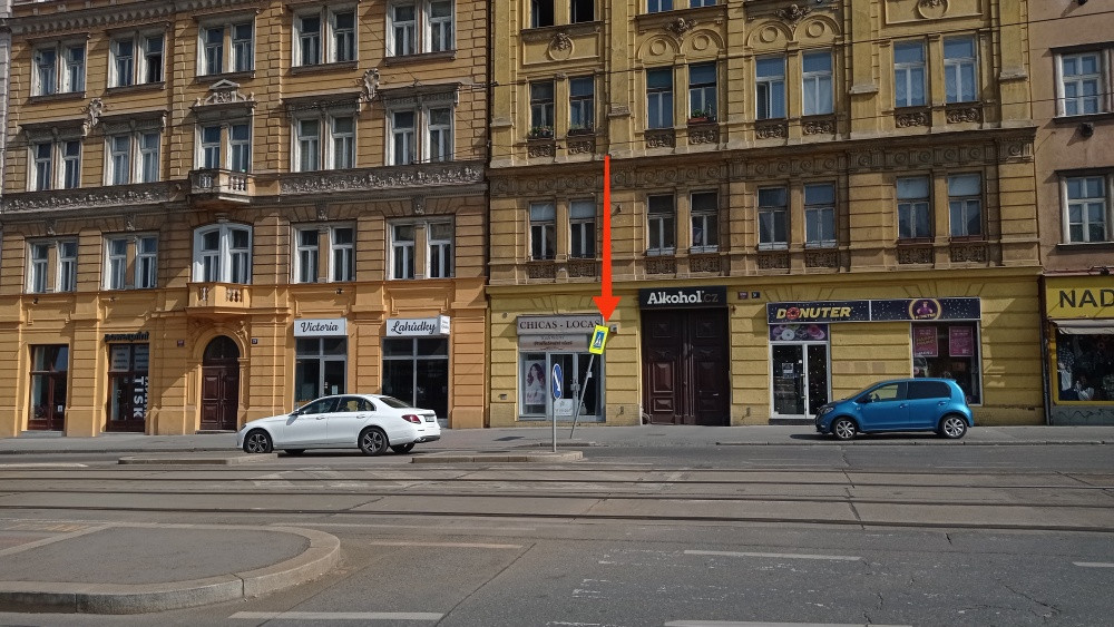 Naproti vyústění ulice Siwiecova do ulice Seifertova se nachází ohnutá DZ "přechod pro chodce."