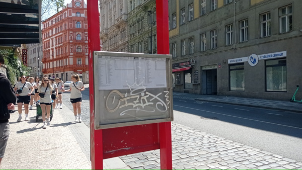 Zadní skříňka na JŘ označníku autobusové zastávky U Památníku směr centrum je počmáraná.