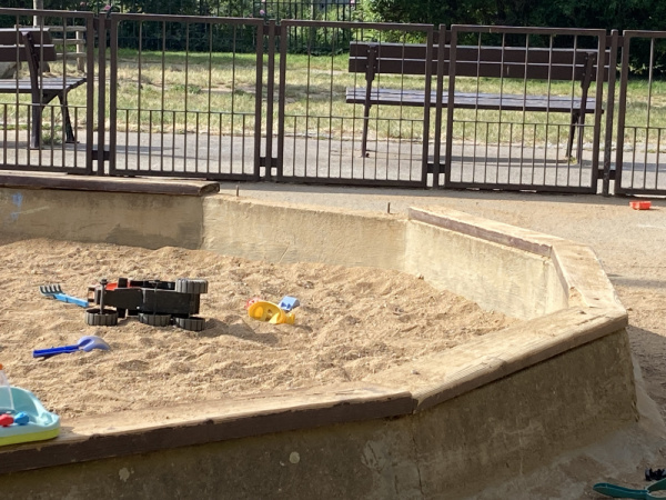 Na dětském hřišti na náměstí Jiřího z Poděbrad chybí dřevěné obložení pískoviště a z betonu trčí dva velké šrouby.