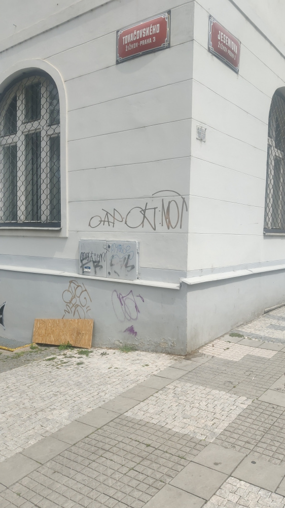 Zapomenutá deska na rohu ulic Jeseniova a Tovačovského.