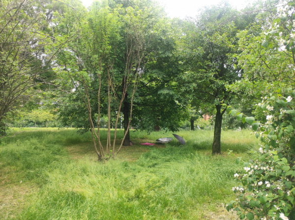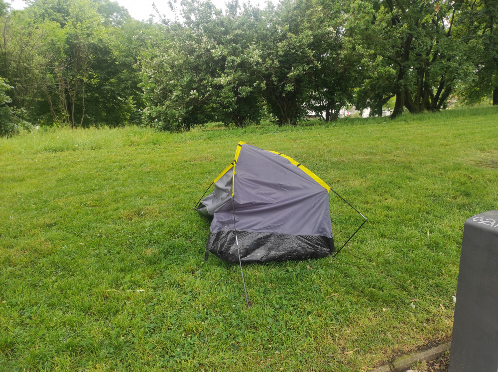 Stan a další odpad v parku Vítkov, stan je hned u chodníku, u ČVO 300507 a další odpad za křovím.