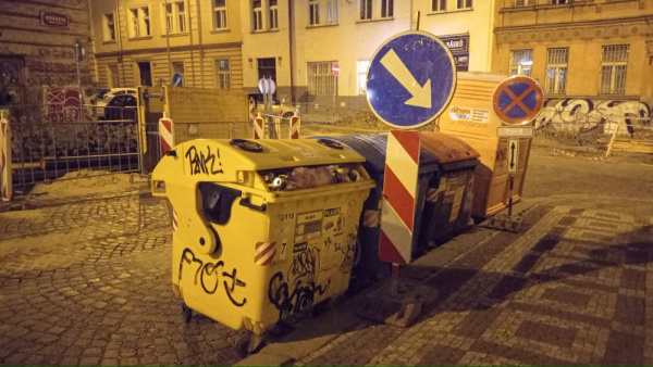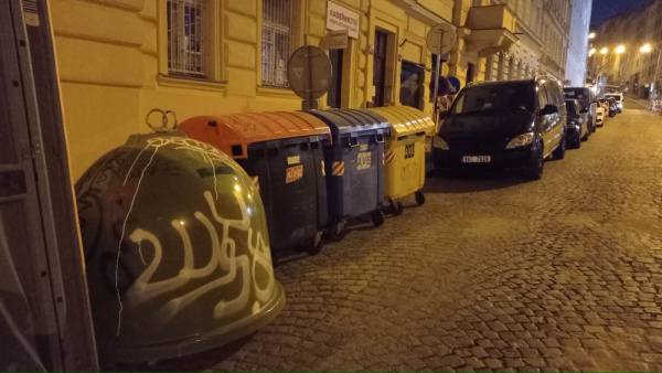 Na křižovatce Krásova x Husinecká na nachází posprejované kontejnery na tříděný odpad číslo 03/118.
