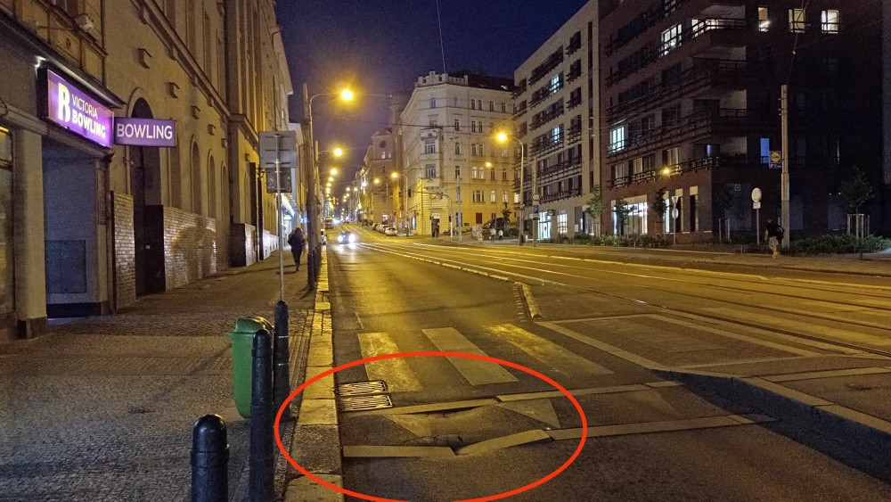 V ulici Seifertova se před tramvajovou zastávkou Viktoria Žižkov směr centrum nachází ve vozovce částečně propadlé obrubníky a zvlněný asfalt.