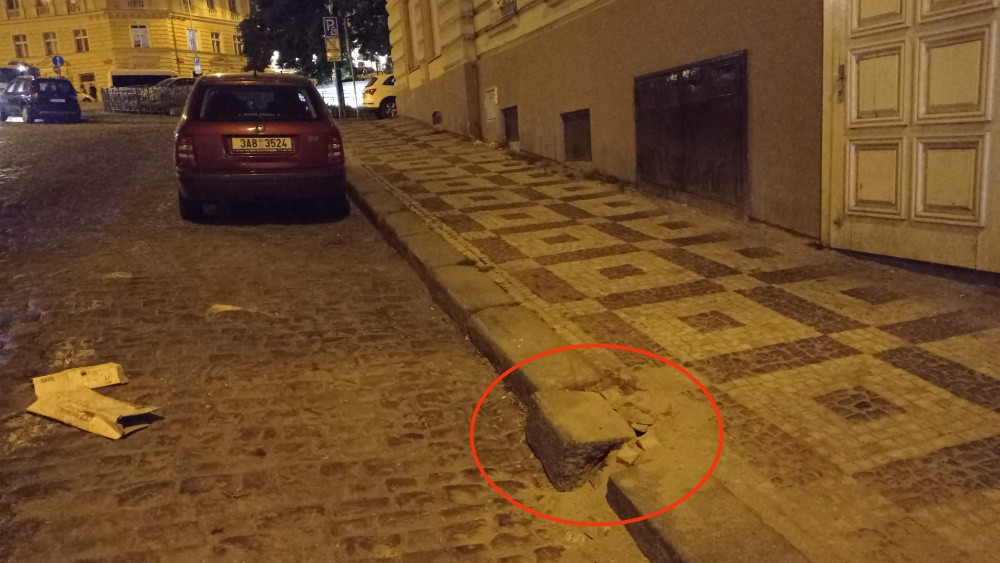 V ulici Jeronýmova se před domem č. or. 3 nachází poškozený obrubník.