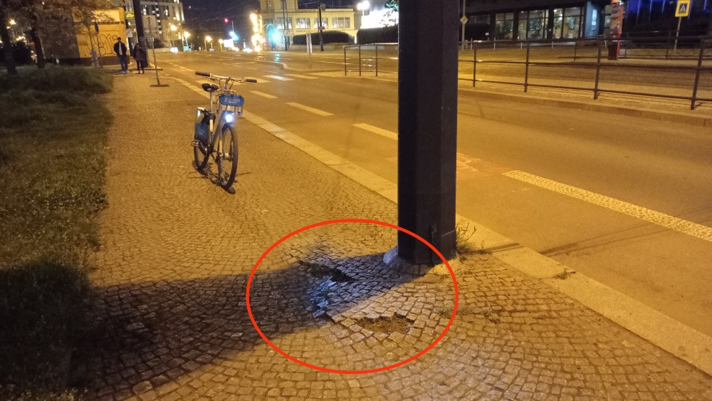 V ulici Vinohradská se u lampy 301 653 nachází v dlažbě chodníku dvojice děr.