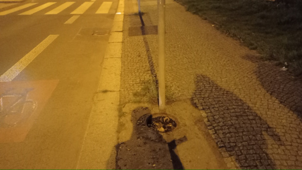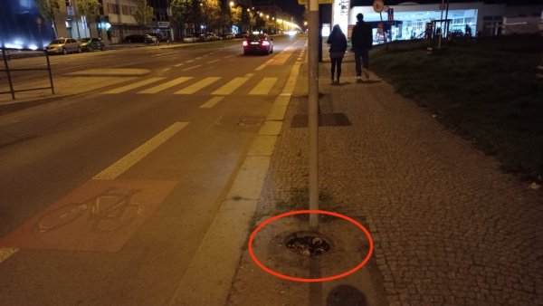 V ulici Vinohradská se u přechodu na tramvajovou zastávku Želivského směr Flora nachází díra v dlažbě chodníku, původní základ nějakého sloupu.