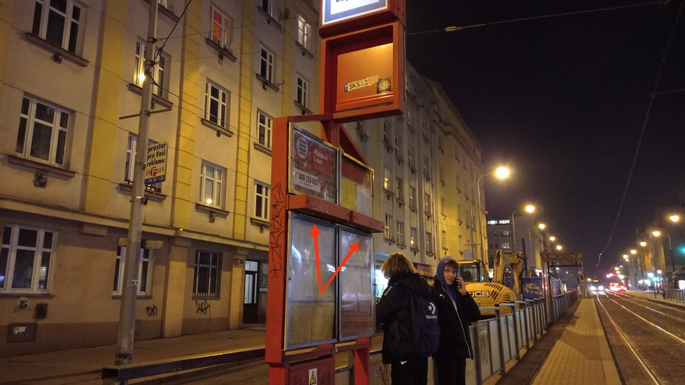 Na tramvajové zastávce Biskupcova směr Ohrada nefunguje ani jedna žárovka osvětlení jízdních řádů.