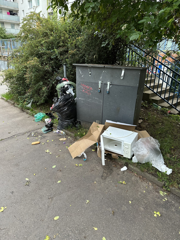Nepořádek a naházený bordel u košů na odpadky u dětského hřiště..