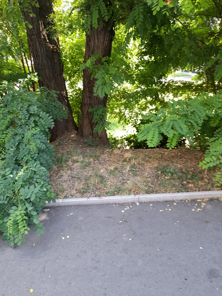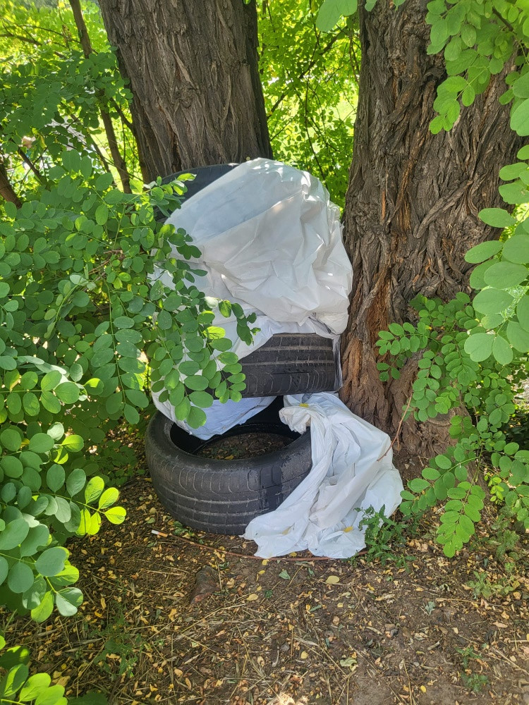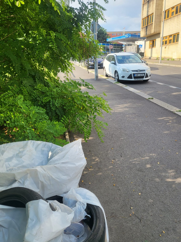 pneumatiky v kerich na kraji parku Radost z ulice Swircova