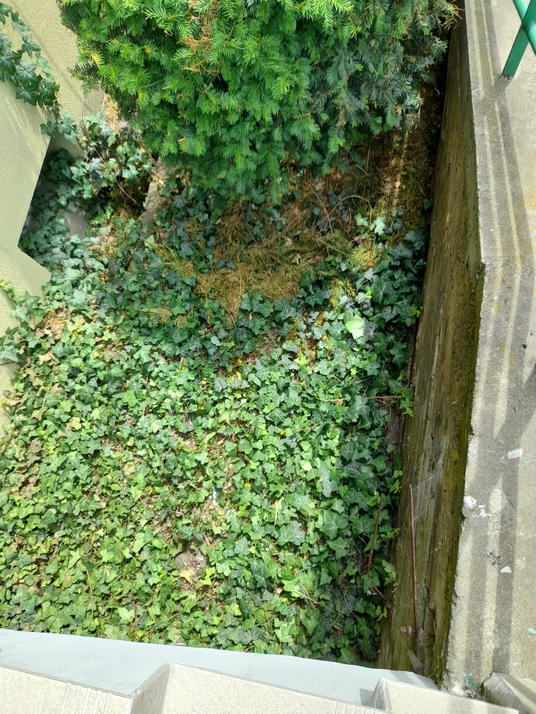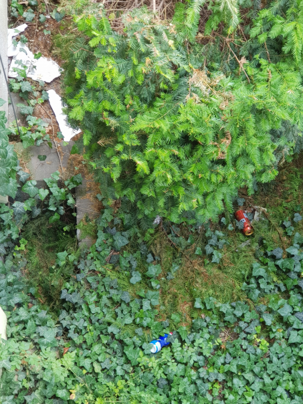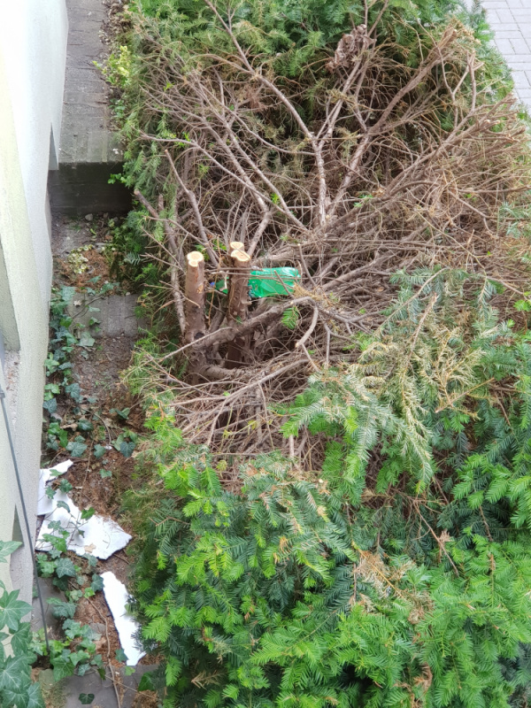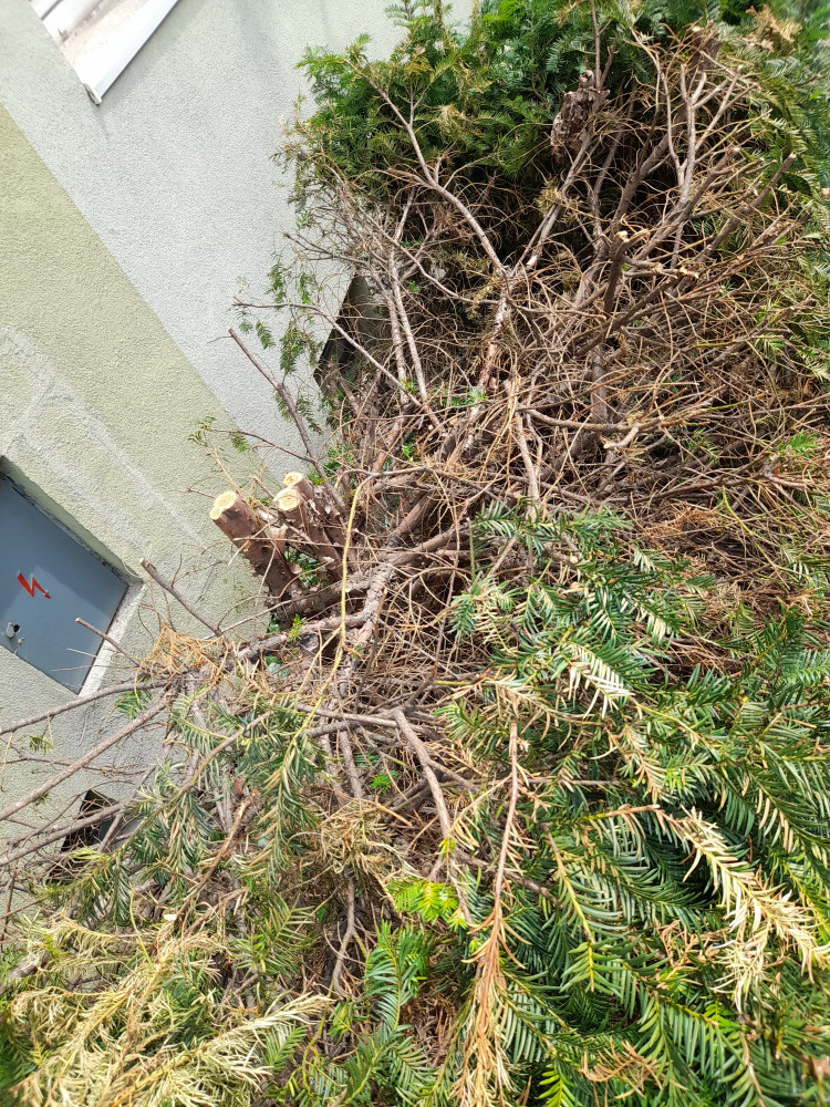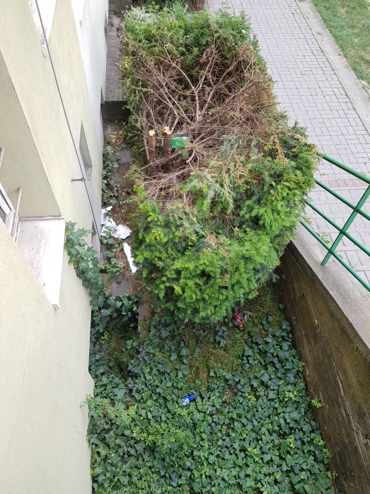 - napadane vetve ze strihaneho stromu pod nim i v sachte sklepniho okna domu, dale neporadek jako PET lahev ve vetvich stromu, plechovky pod nim, kusy rozlamanych bilych desek, pnouci brectan na dum