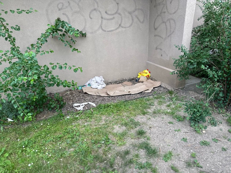 Prosím o odstranění nocoviště. Odložené věci místních “obyvatel” mohou mít neblahý vliv na děti, které si hraji na nedalekém dětském hřišti.