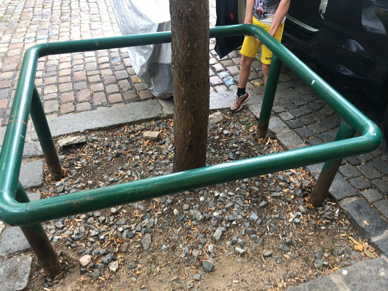 Ze země vylomená ohrádka na strom před vchodem do Zelenky Hajského 11/1665
