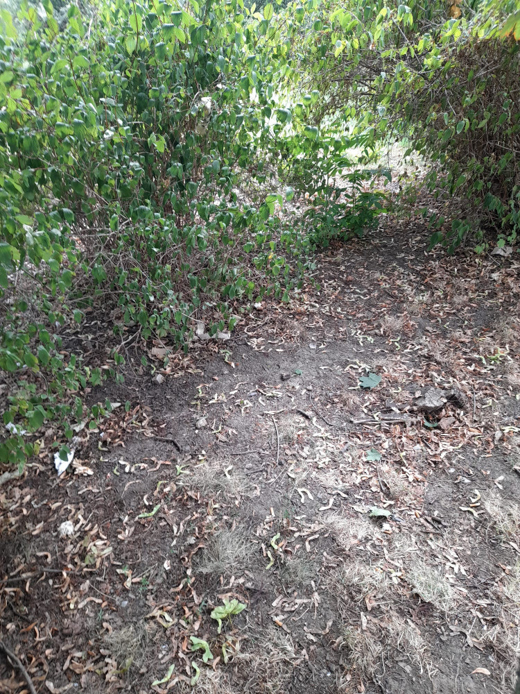 Spaní bezdomovce, vedle dětského hřiště se povaluje několik velkých kartonů - v keřích zřejmě přístřešek bezdomovce.
