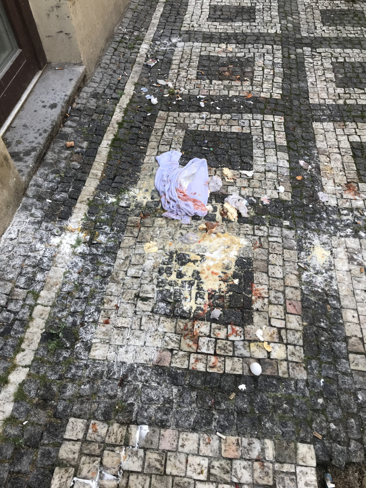 Silně znečištěný chodník, pokusila jsem se to uklidit, ale koštětem a lopatou to nejde, je to směs jídla, syrových vajec, lidských extrementů.