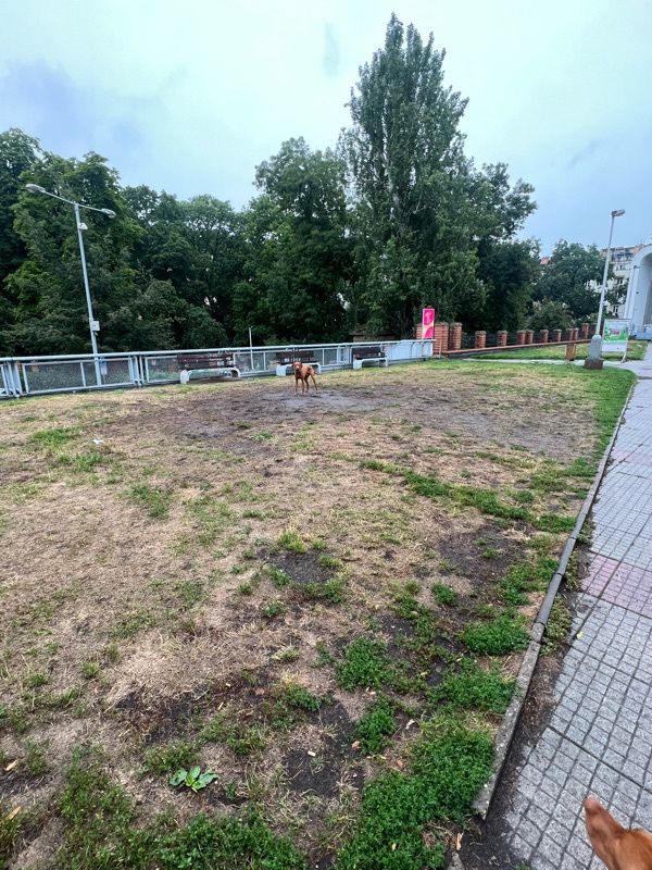 tráva je velmi suchá a park je špinavý s rozbitými lavičkami