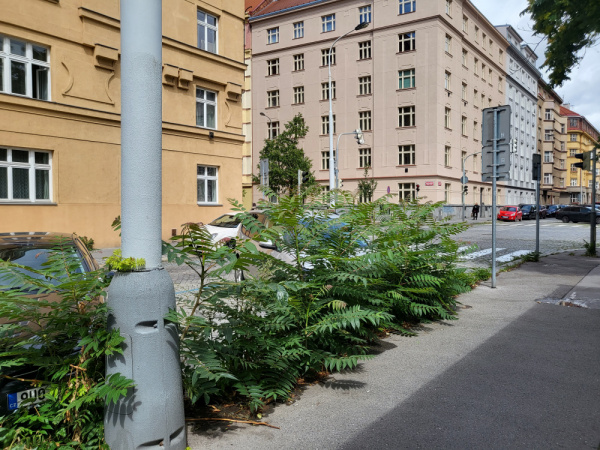 Naletovým dřevinám na okraji chodníku na Slezské u křižovatky s Boleslavskou se daří.
