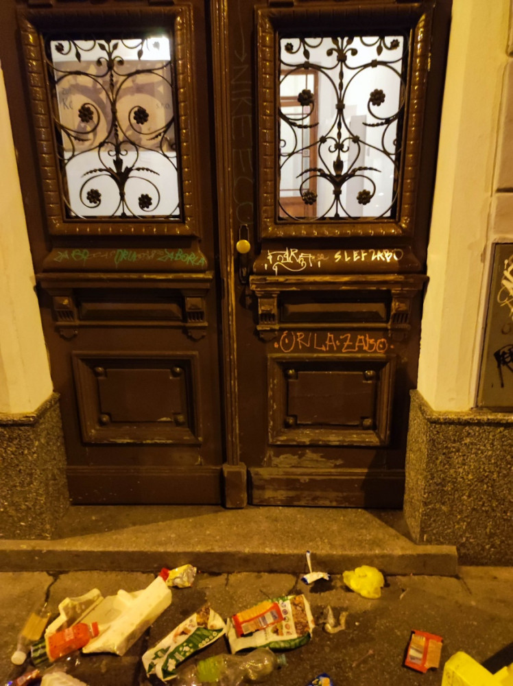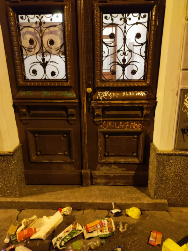 vysypané a převrácené popelnice od vandalů pred domy Seifertova 48 a 46 na tramvajové zastávce Lipanská směrem z centa.