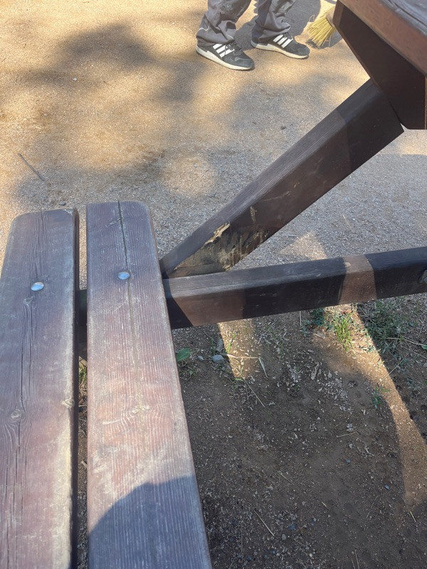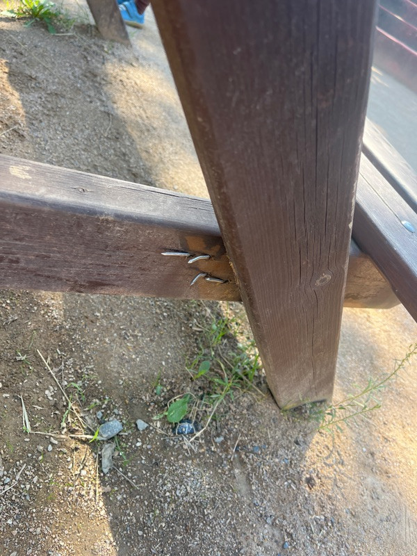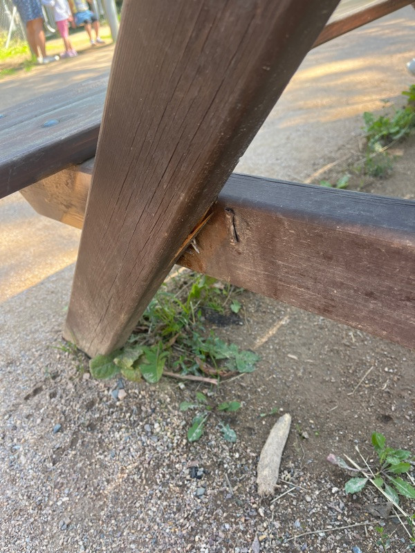 Poskodena lavicka na detskom ihrisku. Nebezpecne trcia sruby.