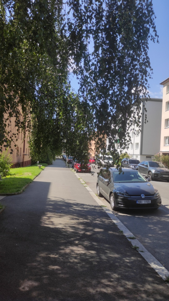 visící větve dolů až na chodník u několika stromů lemující chodník v ulici Na vrcholu