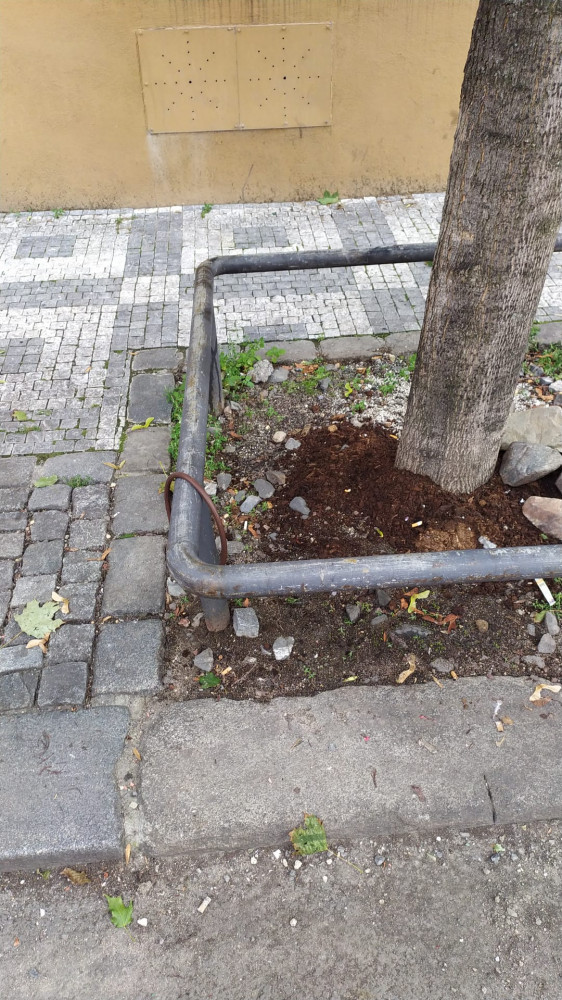 V okoli kmenu stromu se nachazeji krabice - odpad