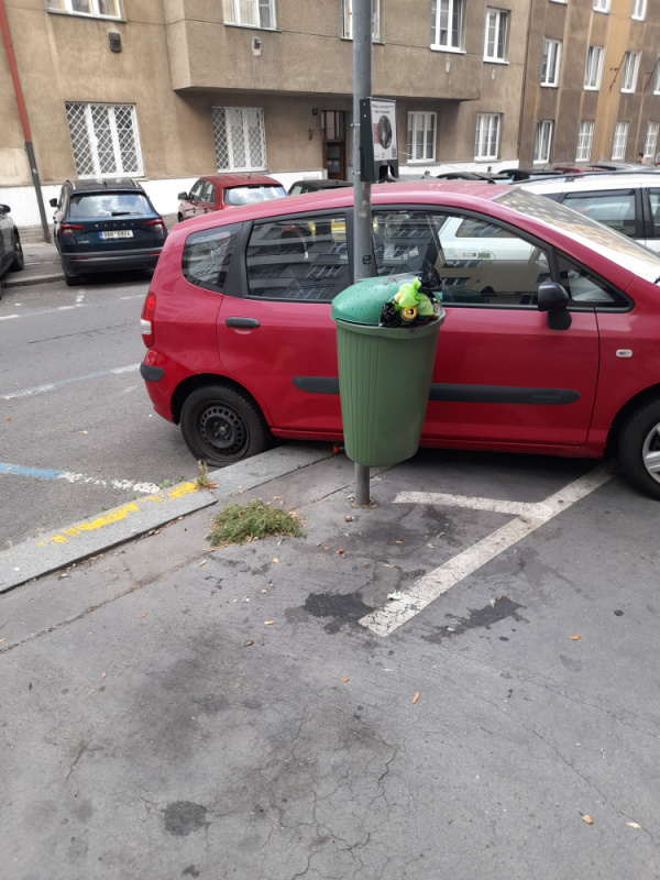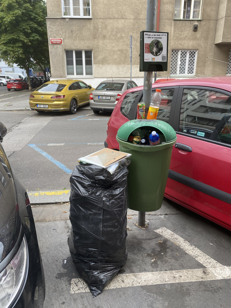 U koše na odpadky na rohu Buchovcovy a Biskupcovy je velký pytel s odpadky.