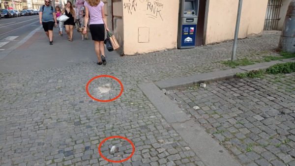 Na Sladkovského náměstí se před odpojením ulice Seifertova nachází dvojice děr v dlažbě chodníku.