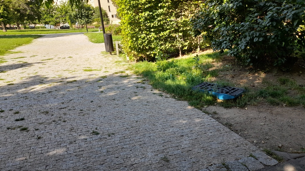 spodní část dopravní značky na kraji parku na náměstí Barikad