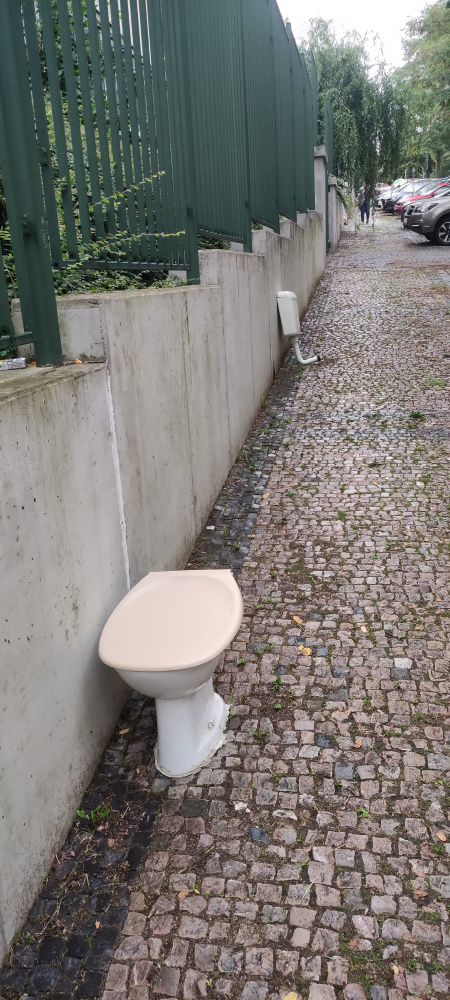 Odložená záchodová mísa a splachovací nádrž u zdi školy Jiřího z Lobkowitz