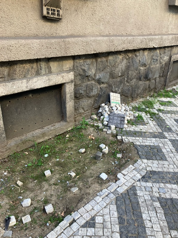 Samostatné kusy kostek a dlažby v ulici Jičínská. Jsou na místě již delší dobu a nic se neděje, nevypadá to, že by jimi někdo plánoval dlažbu doplnit.