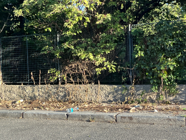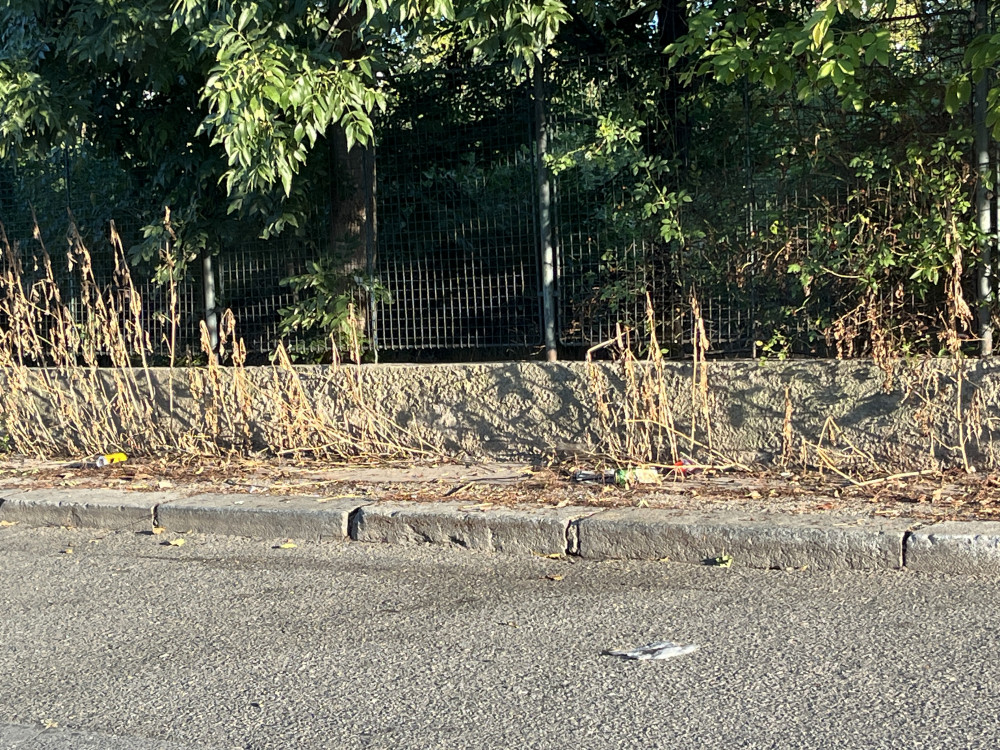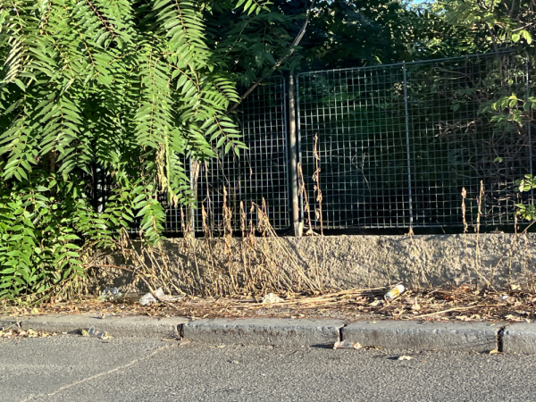 Ulice U Nákladového nádraží - podél plotu celého areálu rozházené odpadky, plechovky od piva a další viz foto.