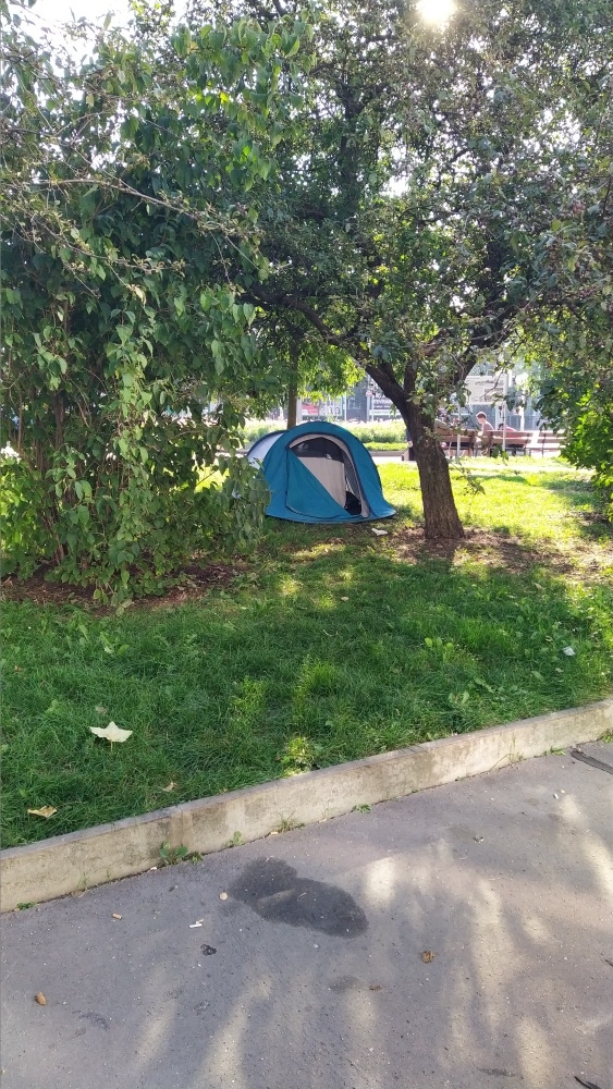 "Kempování" ve veřejném parčíku u tramvajové zastávky.