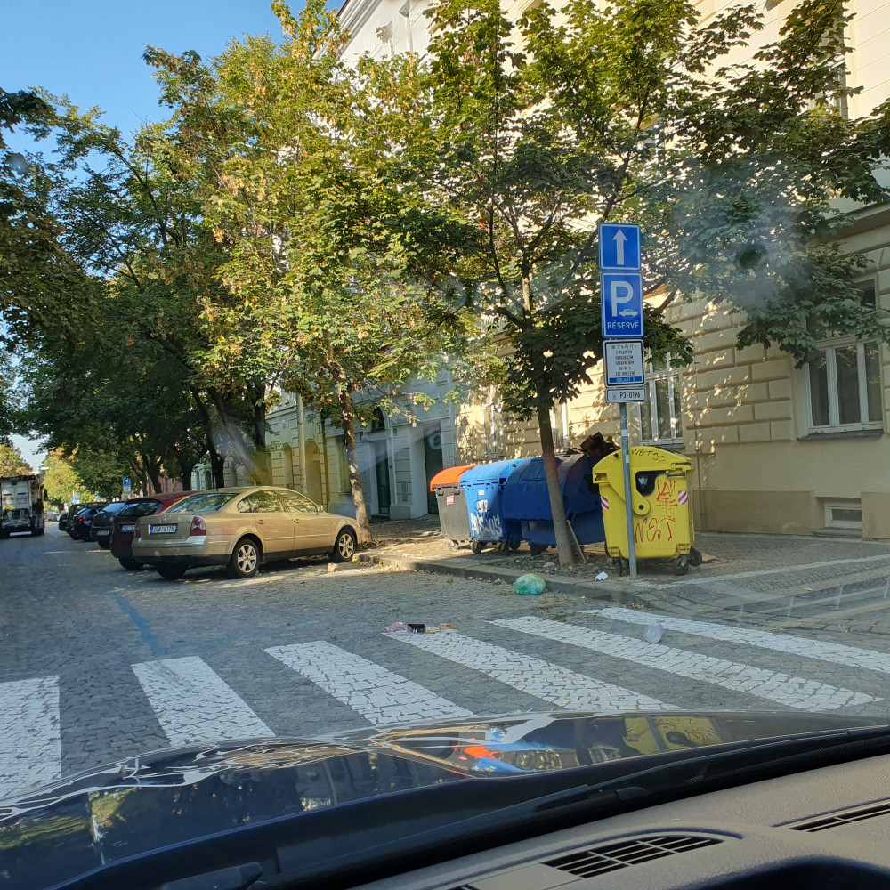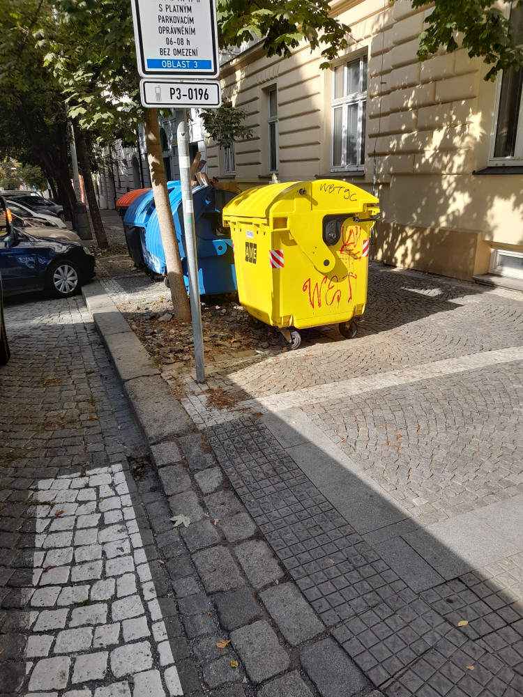 popelaři vyvaželi žlutý kontajner a co spadlo nechal pracovník na ulici a přechodu, viz foto