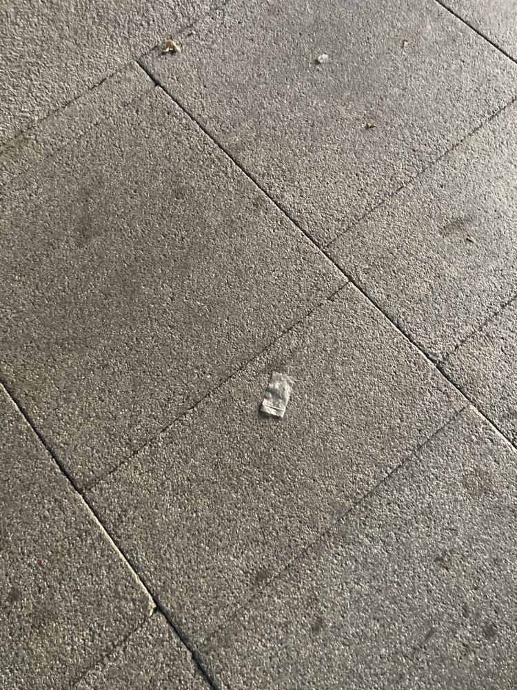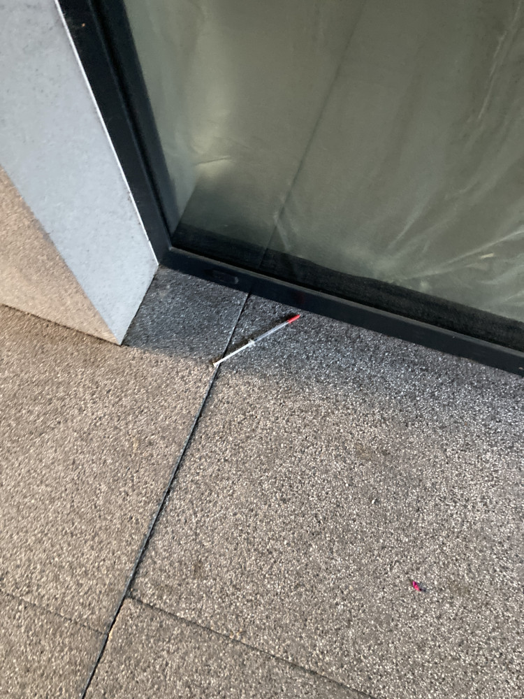 Stříkačka a pytlík od drog v průchodu na Koněvově 45 mezi budovami A a B