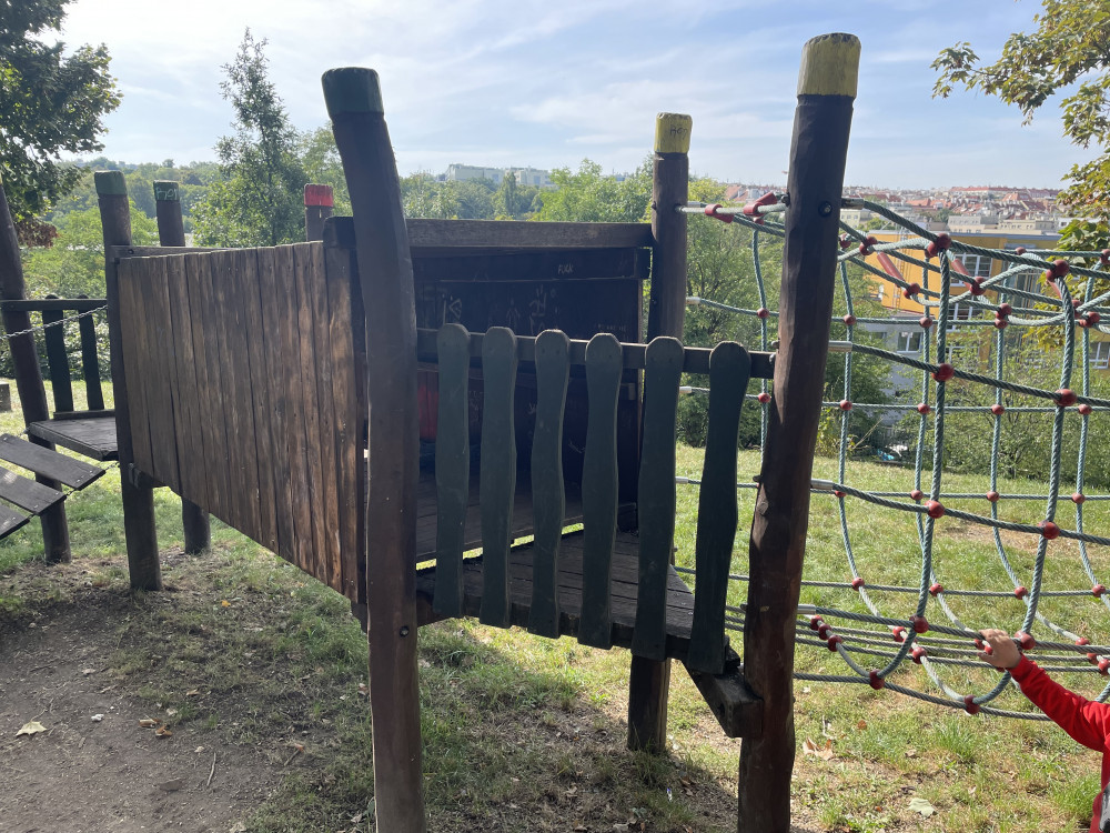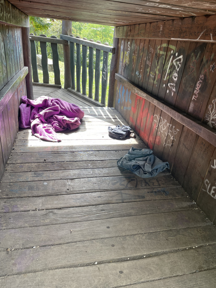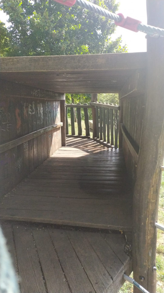 Dobry den, na hřišti na Parukarce (pod stříbrnou velkou klouzackou, nekdo spal v hernim prvku (dřevěný tunel), Je tam nepořádek a lidské exkrementy. P