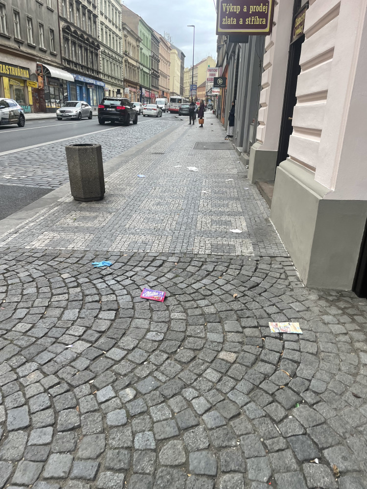 V této ulici máme obchod, kam lidé chodí. Ale je tu problém - odpadkový koš, který se nachází naproti vstupním dveřím do našeho klenotnictví.