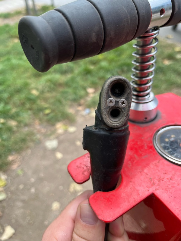Poškozená koncovka pumpy na kolo, nedrží na ventilku (ten větší)