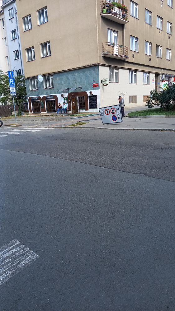 Vyvrácená dopr. značka v ulici Ke Kapslovně.