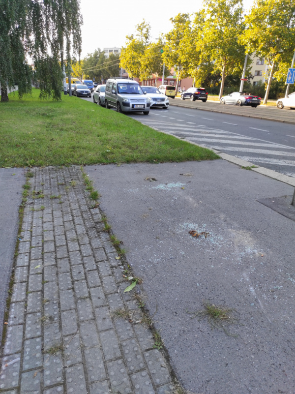 O 50 metrů dál, směrem zastávky Kněžská luka je na chodníku větší množství rozbitého skla.