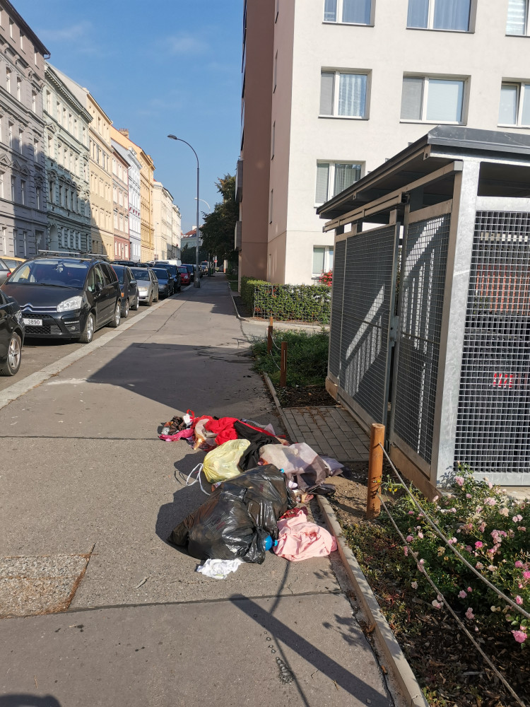 Vyhazené odpadky před zamcenym kontejnerem před Ondříčkova 31