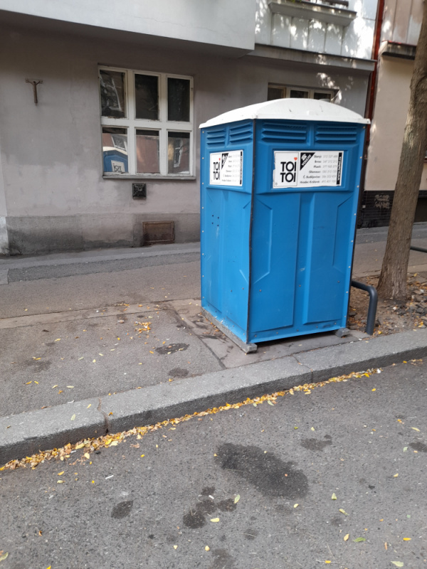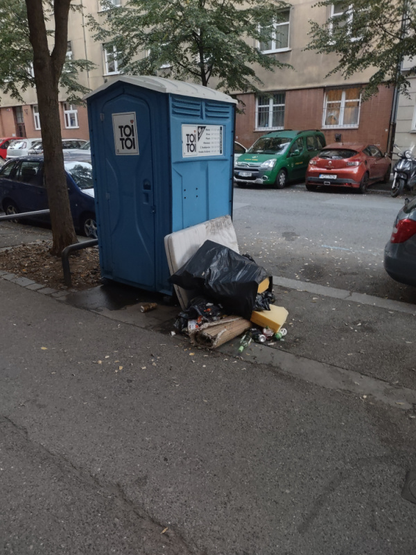 Už několik dnů se před domem v ulici Biskupcova 23 hromadí různé odložené předměty, odpadky, matrace apod. Je to vedle toitoiky, kterou používají dělníci, kteří v budově pracují.