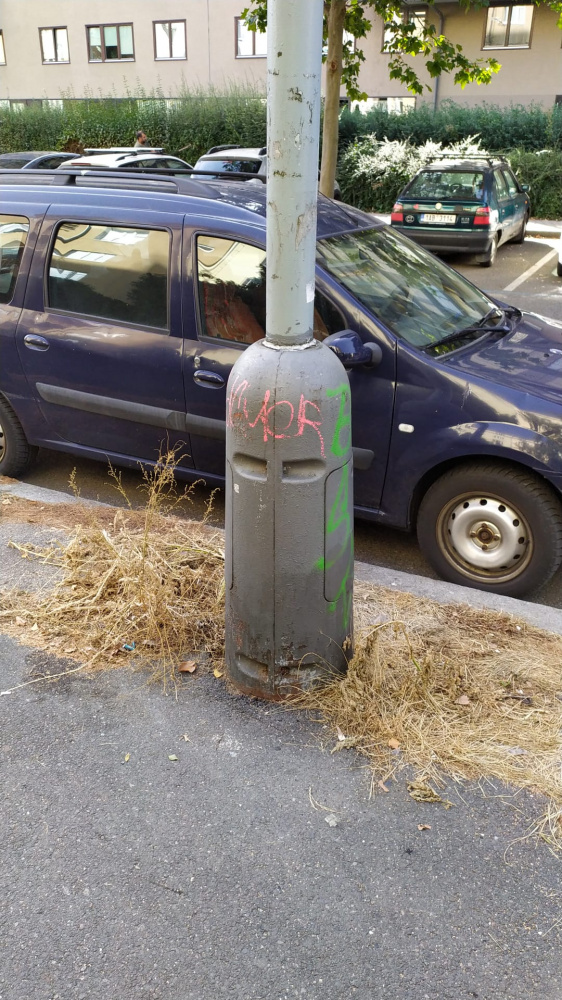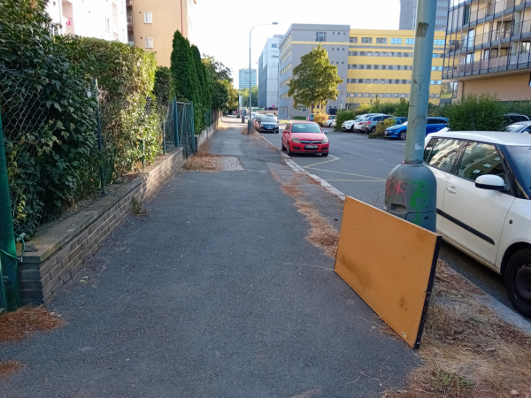 Ke kapslovně 10 proti vrátkům zahrádky. Už se to tam válí dlouho - přes parkující auta to není z jedoucího auta vidět. Děkuji.
