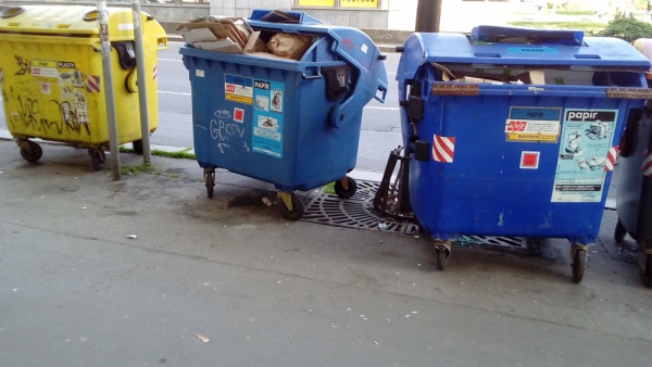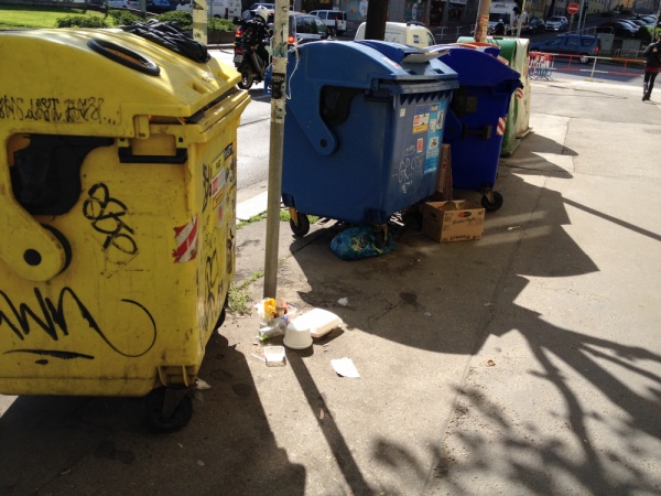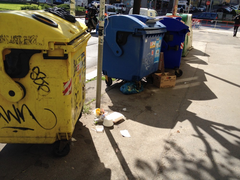 Nepořádek kolem kontejnerů pro tříděný odpad.