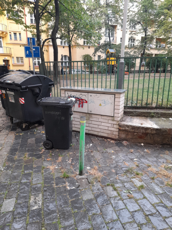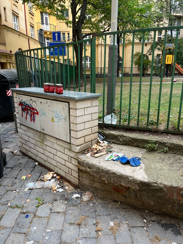 Rozhazene odpadky okolo popelnic ve vnitrobloku u detskeho hriste